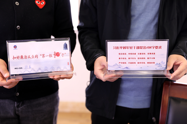 ? ? ? ?會后,公司紀委為10名新提拔干部發(fā)放了廉潔承諾桌牌,提醒他們常把“廉”字記心間,扣好廉潔從業(yè)的“第一粒扣子”。(青紀)