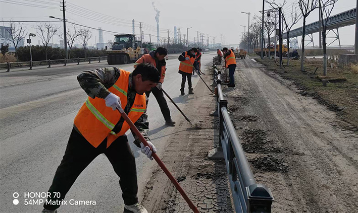 315日,該分公司近15余名黨員突擊隊(duì)員,在黨支部號(hào)召下,無視春光照曬、三人一組、兩個(gè)一對(duì)、揮動(dòng)手中鐵銑,無懼泥土揚(yáng)塵四起,清除蘇海路,港前卡口護(hù)欄下車輛拋灑泥土2000多米長,人工清掃護(hù)欄內(nèi)石子30多處,車輛轉(zhuǎn)運(yùn)20多車。黨員陳小軍、陳海彬等同志盡管手磨破了,仍然堅(jiān)守道路最前沿,經(jīng)過30余名隊(duì)員兩天持續(xù)奮戰(zhàn),整潔靚麗的路面再次展現(xiàn)石化園區(qū)。