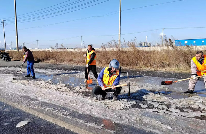 近期由于受冷空氣影響,氣溫低下,園區道路低洼積水處產生大面積結冰現象,如不及時清除,嚴重造成車輛側翻事故發生。道路排查現場,管理人員及時與園區二班對接,聯合開展“破冰保暢通”突擊活動。大家各負其責,齊心協力,揮動手中鐵銑、羊鎬,經過近4個多小時共同奮戰,撬動冰塊近400多塊,清理積水300多平方、20多處。