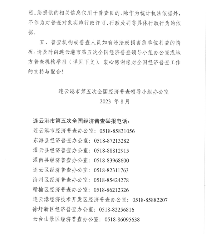 按照《全國經濟普查條例》規定,國務院決定于2023年開展第五次全國經濟普查,為提高經濟普查質量,進一步推進普查工作順利開展,公司按照上級第五次全國經濟普查宣傳動員工作要求,現將《連云港市第五次全國經濟普查單位告知書》公示如下: